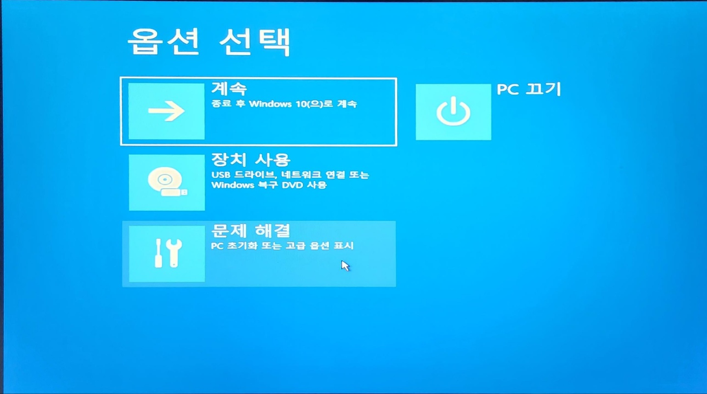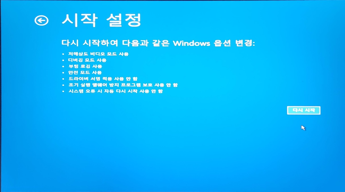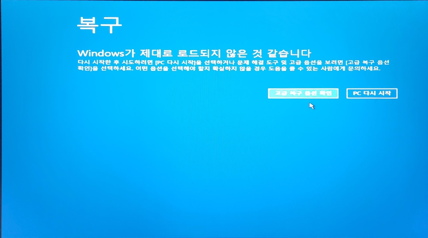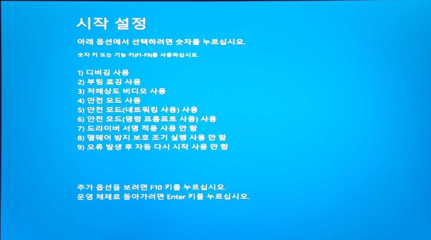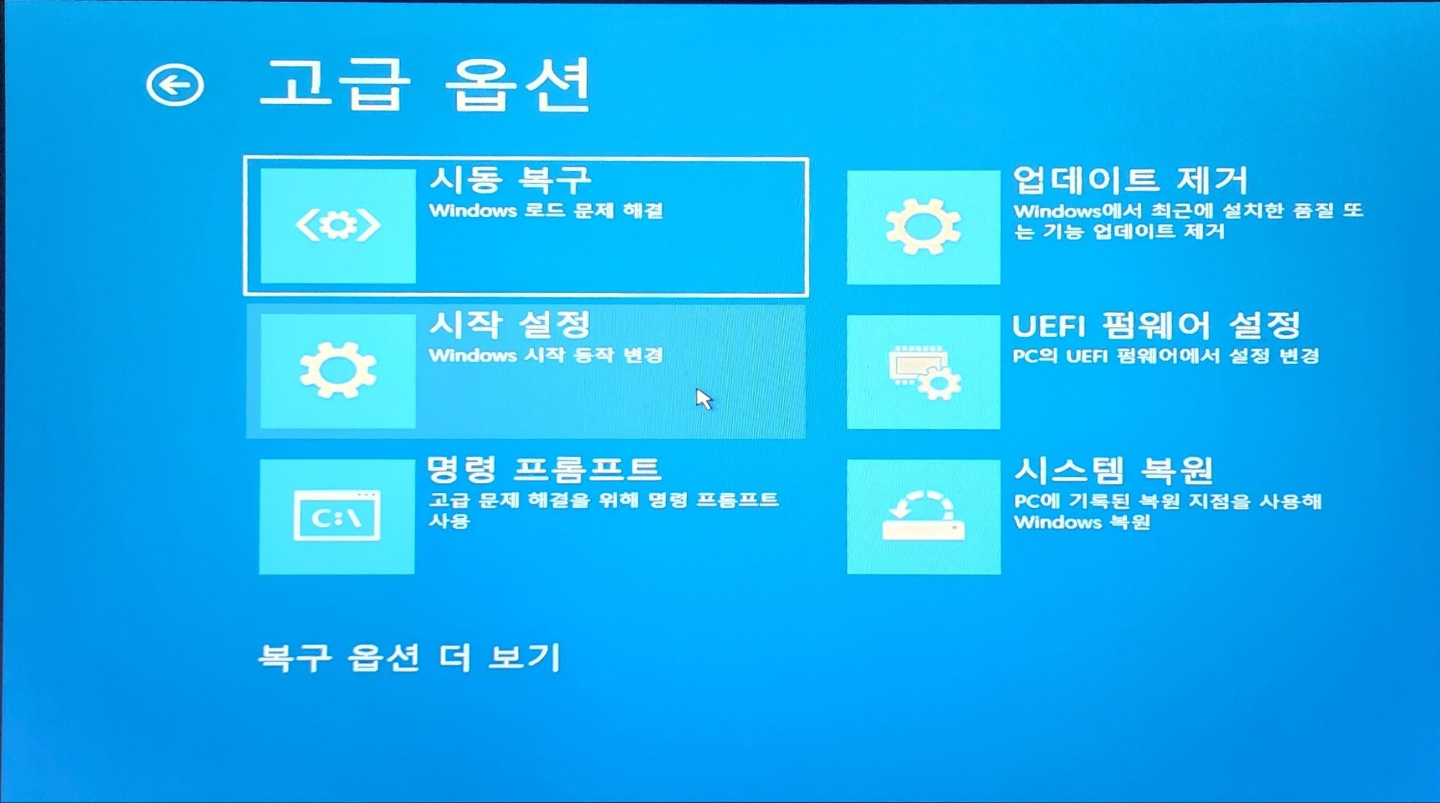 윈도우 진입 불가 시 컴퓨터 강제 재부팅 3회를 하게 되면 부팅 옵션을 선택 할 수 있게 된다.